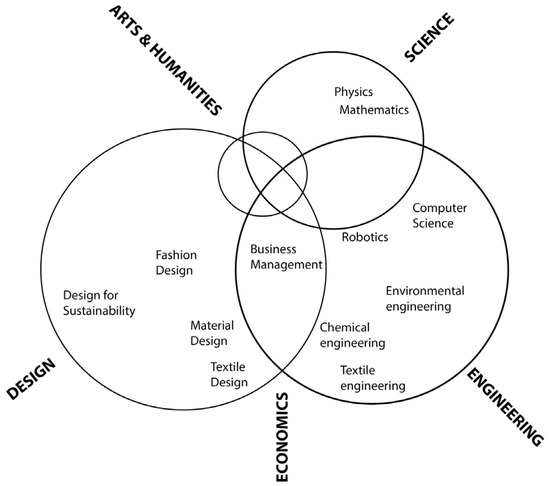 From the data analysis emerged a heterogeneous picture of knowledge and disciplinary fields involved in such initiatives, ranging from design, engineering, and science as the main three domains out of four of creative exploration that are coherent with the research area of interest as highlighted in the previous section (Figure 5). The role of each domain is to maximize the creative and innovative potential of research and development, where the arts and humanities focus on human behaviors and perceptions, science converts information into knowledge, engineering solves empirical problems, and design, like a collector and a central element, takes the solutions to maximize function and enhance the human experience [93] (Figure 5).