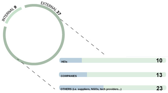 Despite the fact that 13% of the investigated entities operate primarily within their internal boundaries, indicating an internally focused approach, a significant majority work by setting up partnerships, nurturing external collaborations, and emphasizing a more open and collaborative orientation. These data highlight the importance of external partnerships for most initiatives, potentially involving cooperation with: (i) HEIs (21%) to permit organizations to enhance the quality and relevance of their operations, cultivate and fortify their networks of collaborators, nurture their ability to collaborate and internationalize through the sharing of ideas, and develop new practices and methodologies related to fashion-tech, digitalization, and ecosystem innovation; (ii) companies (27%) to improve and develop assets that will lead to a long-term competitive advantage on the market by providing the field expertise and market requirements; and (iii) other initiatives (NGOs, stakeholders, tech providers, or players outside their structure) to foster a comprehensive approach to growth and advancement, where the pursuit of new knowledge is coupled with efforts to enhance or create assets, contributing to the overall progress and development of fashion and technologies (hardware and software). Also, the nature of these partnerships can vary based on each initiative’s specific goals and objectives (Figure 6).