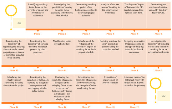 Figure 3 depicts the research concept of utilizing the bottleneck management approach to progress towards the primary planning phase in the CPL. This process encompasses the identification and completion or repeat of the bottleneck management process, to mitigate the impact of the CDF. The presence of complex bottlenecks leading to project delays can be attributed to the simultaneous occurrence of multiple CDFs in CPL. When multiple delays occur simultaneously in a project, the complexity of the bottlenecks might increase, making it challenging to identify and analyze them. Often in construction projects, the client, consultant, or contractor may strategically exploit concurrent delays to rationalize delays and evade accountability and associated expenses. Simultaneous delays do not necessarily occur simultaneously, although they can have overlapping periods.
