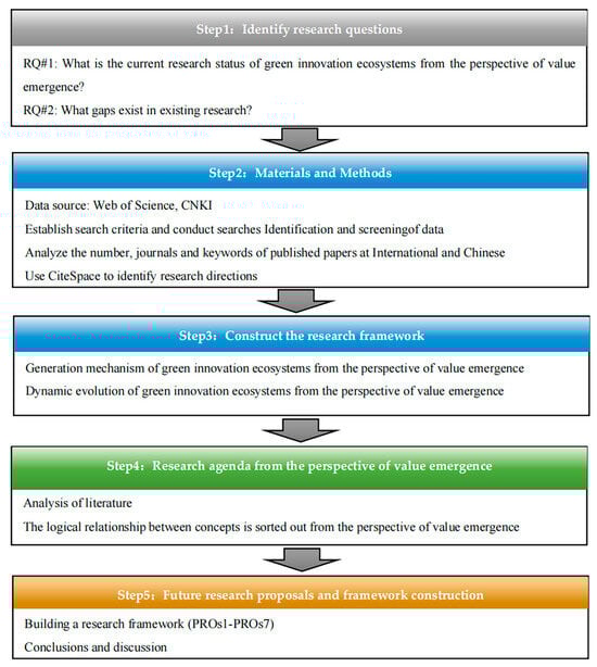 CiteSpace was used for the data processing and visual analysis of the research results of a green innovation ecosystem, and quantitative analysis was used as the main research method. First, based on the analysis results of CiteSpace and with the help of Excel software (2021), the keywords, numbers, and journals of papers published in Chinese and internationally were statistically analyzed. Second, CiteSpace visualization technology was used to carry out cluster analysis on the basis of data preprocessing and cleaning, and two research directions were identified. Finally, by constructing the research framework from the perspective of value emergence, this paper analyzed the literature and proposed directions for future research to answer the following questions: (1) What is the current research status of green innovation ecosystems from the perspective of value emergence? (2) What gaps exist in existing research?