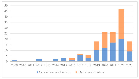 The number of publications published from 2009 to May 2023 is illustrated in Figure 2. Studies related to the green innovation ecosystem have gradually emerged since 2009, and the number of published papers has shown an overall upward trend, with a significant increase since 2016 and an explosion in 2022. This shows that research related to green innovation ecosystems has become the focus of current academic research. In addition, we can see that, with the deepening of scholarly research, the research focus has gradually shifted from research on system generation mechanisms to research on dynamic evolution.