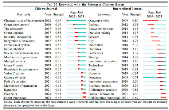 Table 1 shows the top 9 journals in terms of the number of publications published in both Chinese and internationally, and it can be seen that they are all high-quality journals, indicating that scholars pay great attention to related research on green innovation ecosystems, providing space for the discussion and development of this topic. At the same time, compared with the number of publications in the Chinese literature, the number of publications in the international literature was significantly greater. In addition, according to the keywords with the strongest citation bursts in Figure 3, compared with those at the international level, chinese research on a green innovation ecosystem started relatively late, with its focus on the past 6 years. At present, Chinese scholars are focusing on the composition and operation mechanism of the five-helix elements of the system, while international scholars’ research has experienced the generation and evolution of the system, and the current focus is on microlevel action mechanisms, such as collaborative innovation of industry–university–research institutions, which provides guidance for China’s future research.