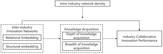 Network density within a single industry refers to the intensity of connections among participants within a strategic emerging industry, i.e., the degree of interconnectedness among these participants [56]. High network density implies more internal connections, which may influence the flow of information, cooperation opportunities, and knowledge sharing both within and outside the industry [57]. A dense network can facilitate a faster dissemination of innovations and best practices, thereby enabling participants to quickly adapt to market changes and technological advancements [58]. This is crucial for the collaborative innovation process, as innovation often requires various forms of resources and knowledge. High network density may help improve the accessibility of these resources and knowledge, thereby potentially fostering collaborative innovation [59]. This interconnectedness can lead to synergistic effects where the strengths of one industry complement the weaknesses of another, facilitating more holistic and impactful innovations [60]. However, the impact of network density within an industry is not only internal but may also affect the relational and structural embeddings of inter-industry networks. Specifically, high network density might strengthen the connections and cooperation opportunities both within and outside the industry, thereby enhancing the effects of relational and structural embeddings in inter-industry networks [61]. This could lead to more extensive industry cooperation, richer resource sharing, and more collaborative innovation opportunities, ultimately enhancing collaborative innovation performance. Thus, the following hypotheses are proposed (Figure 1):