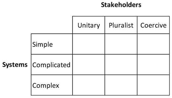 Finally, Jackson [] provides a useful grid for positioning the problem context that ST practitioners face, see Figure 1, which is based on a systems of systems methodology []. The grid has two axes representing the complexity of a problem: “type of systems” (y-axis) and “stakeholders” (x-axis). The type of systems can be simple, complicated and complex. Simple systems involve repeating patterns and consistent events with a clear cause-and-effect relationship this is easily identifiable, e.g., known knowns, with the existence of right answers suggesting a fact-based management []. Complicated systems have similar characteristics to simple, but experts are needed to uncover cause-and-effect relationships, e.g., known unknowns, with more than one right answer possible. Complex systems lack predictability, e.g., unknown unknowns, without clear answers, so there are competing ideas and a need for creative and innovative approaches. []. The horizontal axis indicates increasing divergence of values and/or interests for the people related to the system. In a “unitary” situation, there is clearly shared values and beliefs with related interests, or divergent values and beliefs are ignored. “Pluralist” indicates difference in terms of values and beliefs with similar interests. A “Coercive” situation shows multiple interests with opposing values and beliefs. Hard ST practice can be mostly located between unitary/pluralist and simple/complicated areas. Soft ST may be mapped on the pluralist/coercive and complicated/complex quadrants.