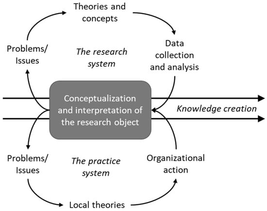 The research method adopted in our study was grounded in several foundational elements. We collaborated with four companies within the context of a multiple case study, where our primary objective was to investigate how production systems could be better prepared and adapted to the challenges posed by shorter product life cycles, increased levels of product mixes, and thereto uncertain production volumes. To address these objectives, we applied an interactive research approach [35] together with the company representatives. According to the interactive research approach, the knowledge creation is generated through both the research system and practice system, as depicted by the model in Figure 1.