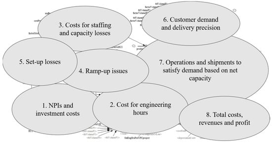 The problem is that few examples that propose the economic sustainability of investments in reconfigurable production solutions exist in the literature that encompass enough complexity of various costs and benefits. For example, Boldt et al. [13], in their bottom-up approach, include estimated costs to expand each specific production capability to an enhanced level of modularity using the theory of RMS, where the cost–benefit evaluation is limited to a design space framed and limited by product project budgets. Helbig et al. [14] propose a method to encompass the life cycle costs of decentralized component-based automation solutions and related costs. Andersen et al. [15] utilize a stochastic model with net present value (NPV) to evaluate various demand uncertainty, labor cost, investment cost, scaling cost, and cycle times. Examples using mathematical models [16] or discrete-event simulations [6] also exist that investigate various technical solutions in relation to their productivity and cost performances. However, neither of these implements a long-term strategic perspective on economic sustainability, especially considering evaluating the systemic behavior to support industrial management in their decision-making. Our research proposal aims to address this gap by enhancing strategic capabilities to increase ambidexterity in exploring and exploiting reconfigurability skills in the manufacturing industry. We propose a conceptual system dynamics model to assess the justification of investments in reconfigurable modularization throughout the life cycle of a production system, considering multiple NPIs and volume uncertainties.