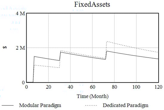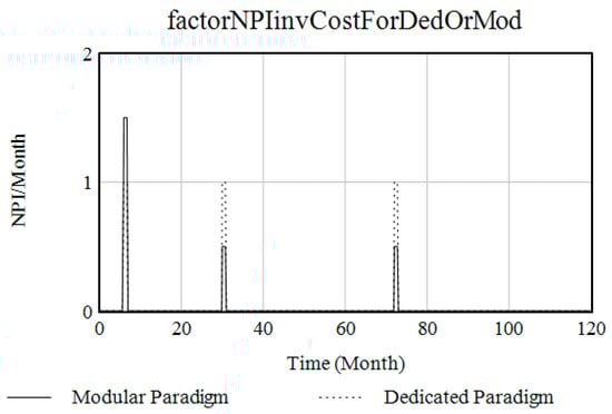 1. NPIs and investment costs. New product introduction projects (NPIs) and new product changes (NPCs) are introduced to the model within this aspect. Each NPI generates modification costs (invNPI), and together with a rate of NPCs (invNPC), these costs total the rate of investments. In the illustrations, three NPIs are introduced, one at 6 months, the second at 30 months, and the third at 70 months, accumulating in the stock AccNPI. For each NPI, four NPCs are introduced per year in both scenarios. To calculate the investment costs for NPIs, a factor is defined to distinguish the dedicated scenario from the modular one; see Figure 4. The factors imply the dedicated approach is neutral (factor = 1), meaning each investment follows a neutral approach, while for the modular approach, the first investment requires a factor equal to 1.5 of the dedicated and thereafter 0.5. Subsequently, this factor impacts the size of the investment costs in a similar pattern and accumulates into the FixedAssets stock, depicted in Figure 5. From the FixedAssets, the depreciation costs are calculated, depleting the asset value.