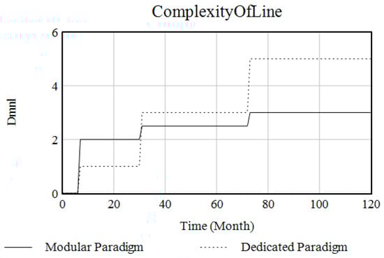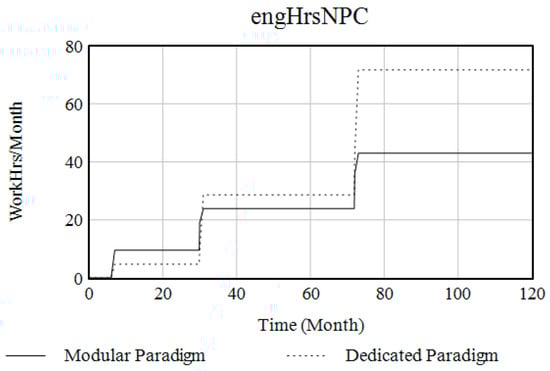Furthermore, the effort factor accumulates into the ComplexityOfLine variable, depicted in Figure 6. As can be seen, the dedicated solution has an index that is lower at first and drastically increases per NPI. Since a dedicated solution is characterized by having only one purpose, therefore, each NPI thereafter creates a more complex modification. In comparison to the modular solution, which is more complex in the offset, it adds less complexity per NPI due to being more adaptable and resilient to changes. These characteristics of the underpinning line complexity impact in a similar pattern the engineering hours required for NPCs by multiplying the ComplexityOfLine with noNPCprojects and the standard engineering hours per NPC project (StdEngHrsPerNPCproject), as graphically depicted in Figure 7.