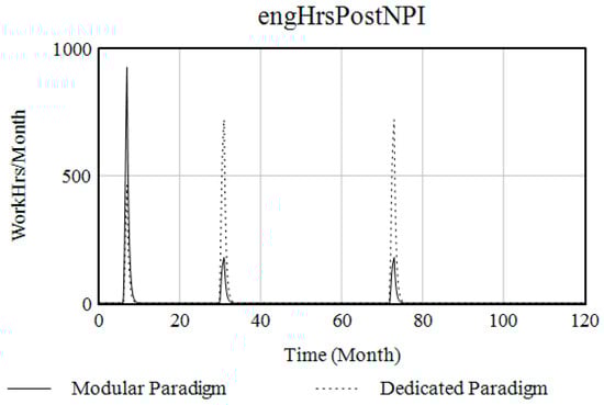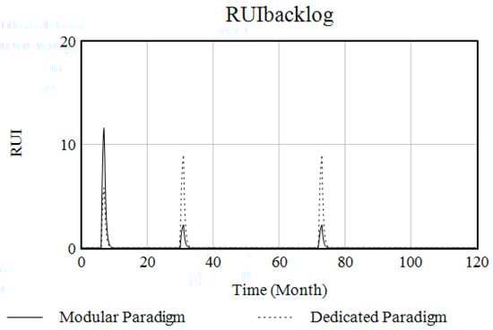 4. Ramp-up issues. Within this aspect, the effects of RUIs on capacity and engineering hours are considered to distinguish between dedicated or modular solutions. Here, the extent to which adhering to a dedicated or modular mindset requires more or less rework in integrated product and production development within the product realization processes is quantified. There are two sources of RUIs, those generated from NPIs and those from NPCs. In the model, the RUIs are considered strongly related to the variable ComplexityOfLine; thus, the effort factor described above in Table 1 is also applied to generate RUIs from NPIs. As depicted by Figure 11, the workload generated by RUIs in the modular scenario is twice as large for the first NPI compared to the dedicated scenario but is only one-fourth in the two subsequent NPIs. These RUIs flow into and accumulate in the stock RUIbacklog, depicted in Figure 12, simultaneously being reduced by the flow of resolved RUIs. Solving RUIs generates the post-NPI engineering hours (engHrsPostNPI) from reworking RUIs, depicted in Figure 8. This stock-and-flow structure for RUIs enables us to quantify the creation of RUIs and their resulting rework losses as a consequence of the time invested in the conceptual phase of designing the production solutions. Resolving these RUIs temporarily impacts the gross capacity, depicted in Figure 13, which also impacts operations, in aspect 6 and subsequently the delivery performance to the customers in aspect 7 and economic returns from the investment in aspect 8.