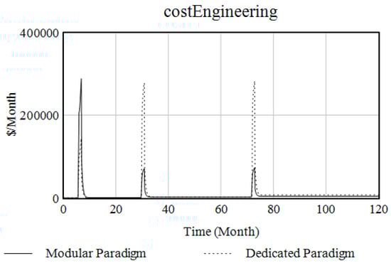 2. Cost for engineering hours. The associated engineering hours as an implication of the amount of work required to realize either a dedicated or modular production system is considered within this aspect. It captures the engineering hours needed before, during, and after the start of production and calculates the total engineering costs. To estimate the required engineering hours, in the variable engHrsPreNPI, for preparing either a dedicated or modular production system, we introduced effort factors. These factors are following the reasoning found in Table 1. On the one hand, preparing a dedicated solution is neutral for the first product P1, while for P2 and P3, twice the time is required due to major refitting needs to accommodate the new product features (because previous solutions were dedicated to P1). On the other hand, the modular solution has an initial effort factor of 2 to indicate the time required to prepare for a modular solution to realize P1. This represents the required engineering efforts to ensure well-thought solutions, while for P2 and P3, the effort is halved due to more flexible and adaptable production system solutions.