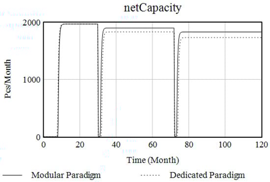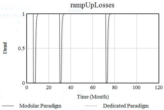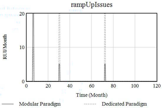 3. Costs for staffing and capacity losses. Within this aspect, the gross cost of staffing and resulting production system net capacity after considering capacity losses are defined. For simplicity reasons, our example uses a gross capacity with the same throughput for all NPIs (where it could be considered that the various products also have different throughput values). This implies that when having only one NPI in the first years, the gross capacity equals the net capacity because there are no changeovers between products. Hence, the net capacity is reduced by the avgSetUpLosses for each NPI; see after the second NPI in Figure 10. The net capacity is also reduced by temporal ramp-up issues (RUIs), which are represented by the temporal dips in netCapacity. The rampUpIssues in need of being resolved are depicted in Figure 11 and are described in the next aspect. From the graphs, we see the dedicated paradigm suffers more from capacity losses than the modular due to a more complex design causing more troublesome setups. In this way, the implications to production can be quantified (see later in aspect 7), including related staffing cost losses summed in aspect 8.