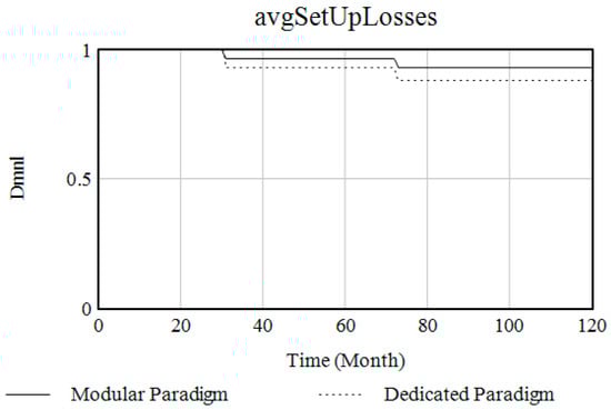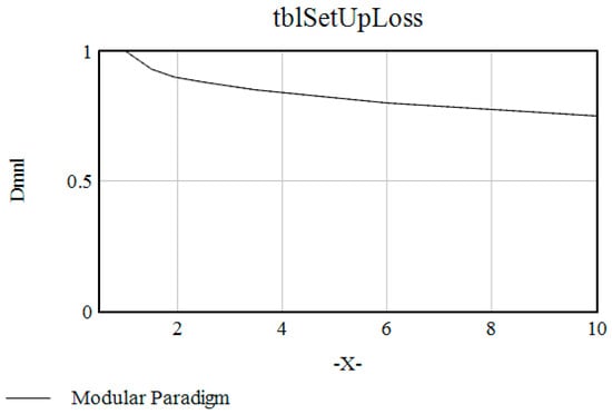 5. Set up losses. To quantify the average set-up losses (avgSetUpLosses), this aspect applies a table function, depicted in Figure 14 with its distinct values found in Appendix A. Together with the variable ComplexityOfLine, depicted in Figure 6, the average setup losses, depicted in Figure 15, are calculated. For both the dedicated and modular solutions, having one NPI provides zero set-up losses. However, in a dedicated scenario, more specific and dedicated solutions lead to more substantial set-up losses when introducing another product, while for the scenario of a modular solution, the implications tend to be less severe due to increased adaptive capabilities due to more reconfigurable and modular solutions. Using the model in an applied scenario, one needs to calibrate the estimated complexity to do changeovers based on evaluating the performance of the specific dedicated or modular solutions that are identified to guide the detailed selection. Moreover, one must determine how adjustments to the table function in Figure 14 configure the relationship between the number of concurrently produced items and the estimated complexity index.