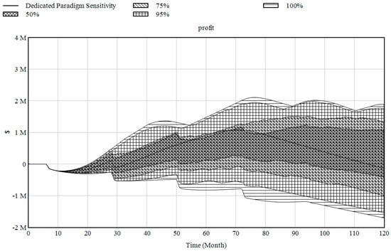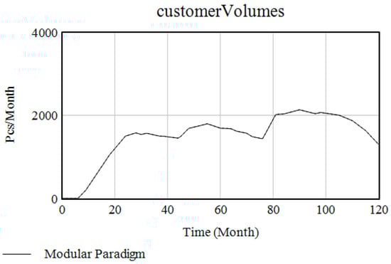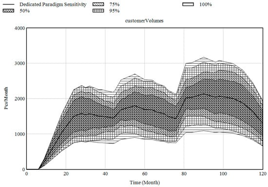 6. Customer demand and delivery precision. Within this aspect, the respective product can be represented, and the uncertainty of expected production volumes can be explored. In our illustration, this is depicted by the graph summarizing all three product volumes, found in Figure 16, and by the sensitivity analysis exemplified by Figure 17. A sensitivity test of the volumes can be used to explore the combined uncertainty effects throughout vital model parameters, later illustrated by the experiments in the next section.