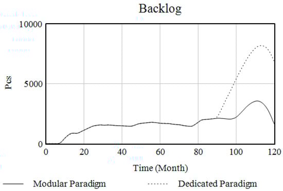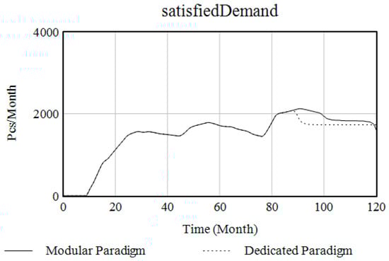 7. Operations and shipments to satisfy demand based on net capacity. This aspect includes an operations module, adopted from a supply chain model in [15], that transforms the customer backlog into shipments. In our case, the major constraint is the netCcapacity defined by the selected approach described above (dedicated or modular) that is affecting the resulting planning and manufacturing cycle time delays. Applying the simulation enables studying the period of interest to evaluate the operational implications from either dedicated or modular designs to the resulting delivery performance. In our model, we consider the life cycle of the production system, enabling studying the effects over the considered product generations. The operations and shipments aspect, consequently function to evaluate how the customer demand is satisfied or not. It can be noticed that the dedicated solution results in a backlog, see Figure 18, due to the lower net capacity discussed above. The output from operations aligns with the satisfiedDemand, depicted in Figure 19. It reveals that the dedicated solution falls short of meeting the customer demand in this illustrative case. Using the model in an applied scenario, one can explore how overtime, in aspect 3, can compensate to meet customer demand. However, automated overtime adjustments to compensate for insufficient net capacity are not yet included in the proposed model, indicating a useful extension for assessing extra overtime costs to compensate for the restricted capacity and attached losses.