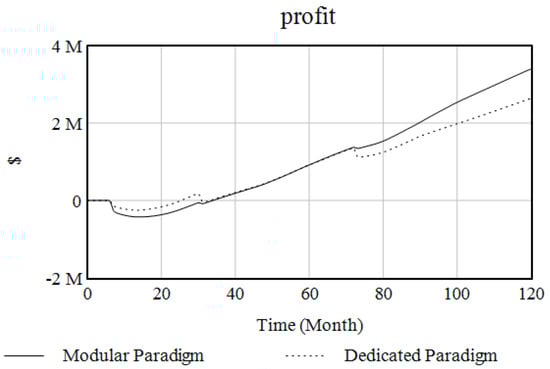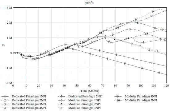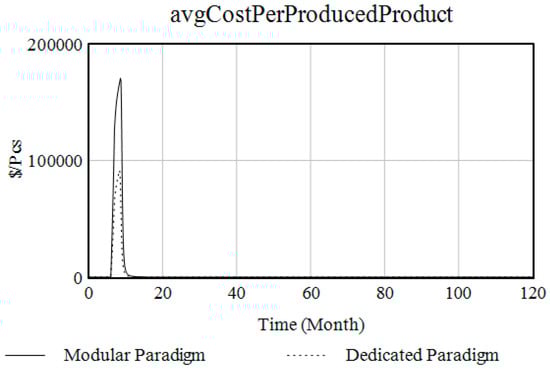 8. Total costs, revenues and profit. Within this final aspect, we accumulate all the cost flows, from engineering hours, staffing, and depreciations, to differentiate the performance of the two scenarios. To measure the overall performance in our example, we observe the differences in profit, depicted in Figure 20. It is noticed that the modular solution initially incurs higher costs during the first NPI, but by the second NPI, both scenarios show comparable profits. By the third NPI, our illustrative case demonstrates higher profitability for the modular approach. These distinctions can partly be traced back to the reduced net capacity, as discussed earlier and illustrated in Figure 18 and Figure 19. Additionally, the average cost per produced product is also noteworthy, as illustrated in Figure 21. Where we find the modular paradigm incurring a higher initial cost and upon closer examination, we observe that it takes until the second NPI in this example for the cost per product to parity. Specifically, just after 57 months, the smoothed cost per product for the modular solution becomes lower than that of the dedicated solution.