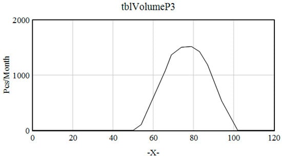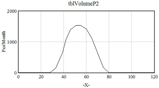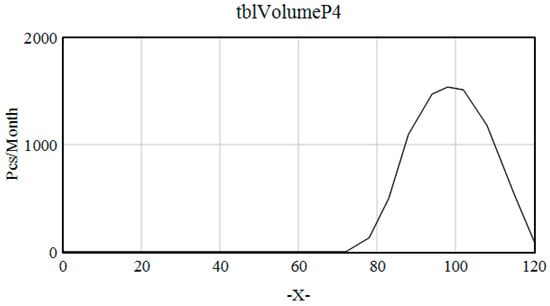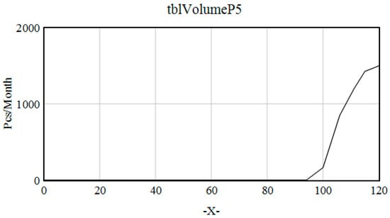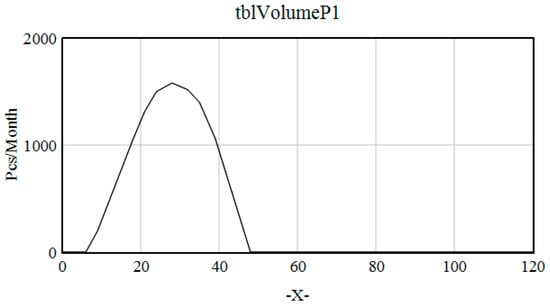 First, for each simulation run, see the first column in the plan of experiments in Table 2; we define the standard volume per product P1 to P5. The specific product volume for each product P1 to P5 follows the table functions graphically depicted in Figure 22, Figure 23, Figure 24, Figure 25 and Figure 26, also specified in Appendix A. Depending on the number of NPIs (noNPI in column two) during the simulated time, this activates the applicable tblVolumePη according to column three in Table 2. The noNPI also sets the corresponding NPIprojects and noNPCprojects, following the introduction schedule according to column four in Table 2.