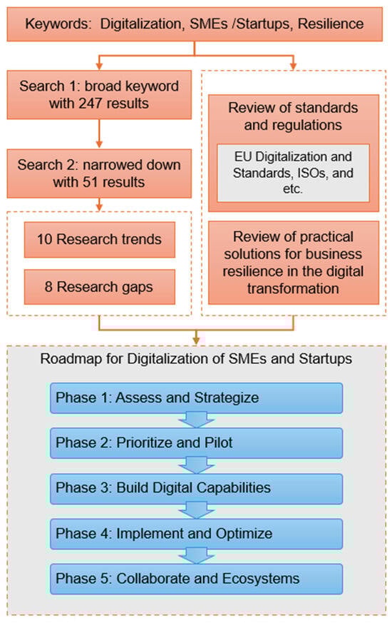 The review of practical solutions examines real-world case studies and best practices for enhancing business resilience in the digital age, including an analysis of 10 key research trends and 8 specific research gaps. Synthesizing these insights, the systematic literature review provides a holistic perspective on the challenges, enablers, and emerging approaches for SMEs and startups to build digital and marketing capabilities and organizational resilience, laying the groundwork for the development of a roadmap in subsequent sections. Overall, this systematic literature review serves as a critical foundation, distilling key knowledge from prior research to inform the roadmap’s phased approach to digitalization for SMEs and startups, ensuring that it is tailored to their real-world needs and constraints.