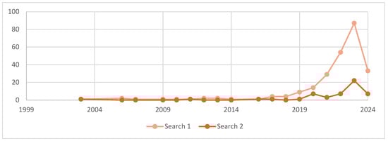The bibliometric analysis reveals a significant increase in the volume of research publications related to digital transformation, business resilience, and the implications for small businesses and startups over the past decade. The first search query, which used the broad term “business AND digital* AND market* AND resili*”, returned 33 publications in 2024 (over the first five months) and 87 publications in 2023, indicating a growing academic and practical interest in this field. The second, more refined search query, which incorporated specific keywords like “Digitalization”, “Resilience”, and “Digital Transformation”, also showed a consistent upward trend, with 22 publications in 2023 and 7 publications in 2022. This consistent increase in research output across both search strategies suggests that the topic of digital transformation and business resilience has become increasingly prominent in the scholarly literature, reflecting the critical importance of these issues for small businesses and startups navigating the rapidly evolving digital landscape (see Figure 2).