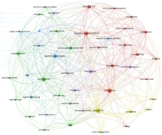 The visualization reveals several distinct clusters. The red cluster focuses on resilience, digitalization, and Industry 4.0, reflecting the urgent need for businesses to adapt and remain resilient in the face of technological changes and disruptions. The blue cluster highlights the role of digital technologies, supply chain resilience, and digital marketing, emphasizing the technological backbone required for effective digital transformation. The green cluster pertains to commerce, supply chains, and sustainable development, showing the economic and environmental implications of digital transformation. Other clusters include themes related to innovation, cybersecurity, and entrepreneurship, underscoring the diverse facets of digital transformation and business resilience.