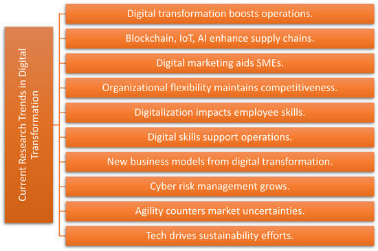 In this section, as illustrated in Figure 7, we delve into current research trends that highlight the transformative impact of digital technologies across various business domains. Digital transformation stands out for its ability to optimize operations, while emerging technologies like blockchain, IoT, and AI are revolutionizing supply chain management. Digital marketing plays a crucial role in empowering small and medium enterprises (SMEs) to overcome traditional barriers and compete effectively in the digital marketplace. Additionally, organizational flexibility and digital skills are recognized as key factors in maintaining competitiveness and supporting resilient operations. The evolving landscape also emphasizes the growing importance of cyber risk management and the adoption of agile strategies to navigate market uncertainties. Ultimately, technology not only boosts operational efficiency but also drives sustainable business practices.