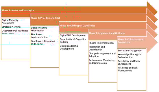 However, the successful implementation of digital transformation goes beyond the mere adoption of technology. It requires a holistic, organization-wide approach that aligns digital initiatives with the firm’s strategic objectives, organizational capabilities, and cultural norms [,]. This transformation process often involves the redesign of business models, the reengineering of core processes, and the development of new skills and competencies within the workforce.