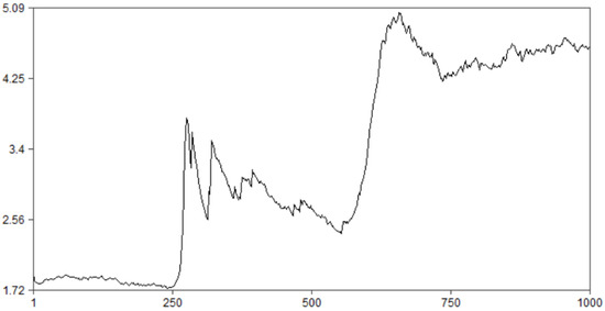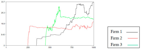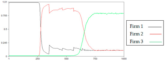 At the initial stage of the simulation, there is only one incumbent firm (Firm 1) in the market, which is in the first stage of the dynamic evolution of manufacturing servitization. Firm 1 possesses a technology that allows it to occupy a monopoly position in the market. As time passes, in the 150th period, the new technology TK1 appears in the existing technology space. At this point, due to the dominant position of Firm 1 in the market, there is no existential crisis of any kind, and the original technological path is still maintained. The appearance of technology TK1 provides a window of opportunity for other firms to catch up with Firm 1. After the emergence of technology TK1, Firm 2, which has mastered technology TK1, enters the market. Due to path dependence, Firm 1 cannot react to the changes in the current market dynamics in time. This allows Firm 2 to catch up with the dominant position that incumbent Firm 1 previously held in the market in a very short period through the strategic advantage offered by technology TK1. As we can see in Figure 2, Firm 2 enters the market and quickly captures most of the market share.