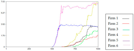 Based on the model of market structure A, further research is being conducted on the dynamic evolution of manufacturing servitization in market structure B, which has six firms and two new technologies. In market structure B, the manufacturing-facilitating technology TK1 and the service-facilitating technology TK2 appear in the 200th and 450th periods, respectively. As we can see in Figure 5, there are two initial firms in the market, Firm 1 and Firm 2, where Firm 1 occupies a larger market share and is the dominant firm in the current market. Before the emergence of technology TK1, the market shares occupied by Firm 1 and Firm 2, although different, were relatively stable, and there was no existential crisis for both firms. So, neither firm intensifies its search in the technology space and only utilizes the existing technology for its production and operation.