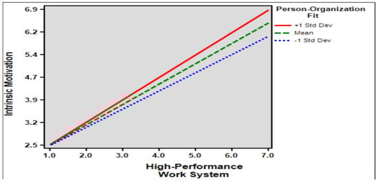 Fourth, this study tested the moderating role of person–organization fit on the relationship between high-performance work systems and intrinsic motivation. A multiple regression analysis was conducted using the SPSS 23.0 to verify the hypothesis. Table 6 presents the analysis results for Hypotheses 5. The results showed that person–organization fit positively moderated the effect of a high-performance work system on intrinsic motivation (ß = 0.088, p < 0.01). Therefore, Hypotheses 5 were supported.