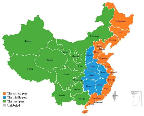 China is a vast country with a large population, and its economic and technological development shows obvious geographical differences [,]. Domestic and foreign scholars generally divide China into three major regions, namely, the eastern region, the central region and the western region, for the purpose of research, as shown in Figure 1. As an important engine of China’s economic development, the eastern region has always led in terms of GDP per capita and government expenditure on social security []. Universities, research institutions and enterprises in the eastern region possess a large number of patents and scientific and technological achievements []. Scientific research institutions have also actively introduced advanced foreign technologies and, through digestion, absorption and re-innovation, have continued to promote the development of scientific and technological innovation []. The central region is at the middle level of China in terms of economic output and government expenditure on social security. The central region has a better industrial base, but agriculture is still its dominant industry. In recent years, the central region has been actively promoting the strategies of industrialisation, urbanisation and agricultural modernisation, and accelerating the pace of upgrading and transforming the industrial structure []. Although the western region is lagging behind economically, its government expenditure on social security is growing rapidly. This is mainly due to the fact that the western region is endowed with abundant resources and relatively low labour costs. The imperfect industrial system in the western region has led to its weak scientific and technological innovation capacity. As the government has increased its support for the western region, enterprises in the western region have begun to pay attention to scientific and technological innovation, constantly improving their technological level and beginning to transform [].