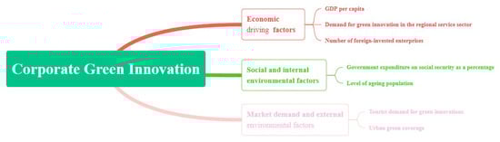 The influence of enterprises on green technology innovation is reflected in three core dimensions: the economic, social and market demand dimensions, as shown in Figure 2. At the level of economic drivers, these cover the high per capita gross regional product, the growing demand for green technology innovation in the regional service sector and the increase in the number of enterprises with foreign investment, which, together, drive the transition to green innovation []. An experiment carried out by Peng et al. found that higher per capita output has a positive impact on green technology innovation upgrading. With the increase in residents’ income, the individual’s requirements for quality of life will be increased accordingly, especially for the quality of the environment. Residents will pay more attention to environmental issues and participate more actively in environmental protection activities, thus promoting green innovation upgrading []. The increase in the disposable income of the population has driven the growth of social demand for green products, and enterprises need to respond to this change through green innovation. The service industry, as an important engine of economic growth, also needs to optimise and upgrade its industrial structure through green innovation, and enterprises with foreign investment, seeing the huge potential and business opportunities in the green market, will increase their investment efforts to jointly promote the process of sustainable development [].