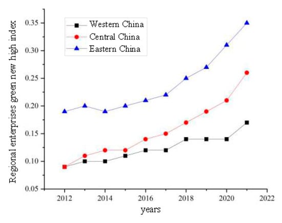 The green technology innovation development level of each region in China from 2012 to 2021, measured by this paper based on the entropy value method and the comprehensive green technology innovation index, is shown in Figure 3. The green technology innovation index in eastern China is leading; the central and western regions are gradually developing, but the gap between these and the green technology innovation index in the east is showing a widening trend. Overall, the green technology innovation index is steadily increasing. However, the western region needs more attention and investment to narrow the gap between them and the east and centre and promote the balanced development of green technology innovation in the country.