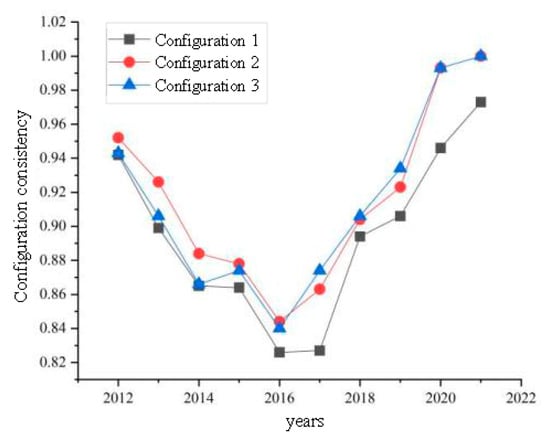 It is found that the adjusted distance of inter-group consistency for all three groupings is not greater than 0.3, indicating that there is no significant time effect. Further examination of its temporal changes reveals that the consistency levels of the three groupings show a decline from 2012 to2016. However, they collectively show a period of rapid growth in 2016–2021. As shown in Figure 4, among them, group state 3 has the fastest growth rate for inter-group consistency, growing from 0.84 to 1.00. The reason for this is that our government intervention plays a crucial role. Checking government websites and local service platforms finds that 60% more documents were released in 2016 to promote green development compared to in 2015. Meanwhile, the government sends out strong intervention signals. In terms of policy intervention, the Chinese government has introduced a series of policies to encourage green innovation and sustainable development, such as providing financial subsidies, tax incentives and loan facilitation, in order to incentivise enterprises to increase their research and development in green technologies. Regulatory constraints: the government has strengthened the formulation and enforcement of environmental protection regulations, imposing strict limits on pollution emissions and energy consumption. Government in green procurement: as one of the largest consumers, the government has given priority to green products and services to encourage enterprises to actively develop green products and enhance their green innovation capability [].