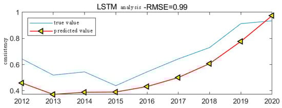 Using MATLAB 9.12, the article constructs a consistency prediction model for the sustainable development of green innovation in local enterprises, as shown in Figure 5. The root-mean-square error (RMSE) of the model is 0.9, a value that indicates that the predictive accuracy of the model can be applied to consistency prediction. The RMSE is a commonly used metric for assessing the predictive ability of a model which measures the magnitude of the model’s error by calculating the mean of the squared difference between the predicted value and the actual value. A lower RMSE value means that the model has a higher prediction accuracy. From the trend of the model’s prediction graph, it can be observed that the overall trend of the consistency index of the sustainable development of green innovation of local enterprises shows a gradual decrease followed by a rapid growth trend. According to the prediction trend, China’s progress in green technological innovation is gradually accelerating, and the consistency index of enterprises’ sustainable development of green innovation will be maintained at around 0.90.