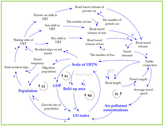 The URT will alleviate traffic congestion and reduce traffic emissions, thereby contributing to air quality levels and promoting UD. UD is beneficial for the scale of URTN. This is a negative feedback loop.