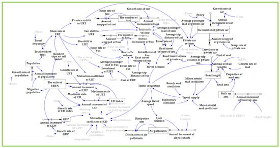 Considering various factors influencing UD, this study explored a reasonable URTN scale that matches UD. In this study, factors included the economic development level, population growth trends, land use, and environment. The environment is mainly represented by road traffic pollution. The road traffic encompasses the use of private cars, taxis, and buses for traveling. New shared mobility options [41], such as ride-sourcing, are included as the road traffic flow in the model. Other transportation modes, such as motorcycles and bike-sharing [42,43], are not considered. Therefore, the system boundary involves six subsystems: URT, UD, urban economy, urban population, urban land, and urban environment subsystems.
