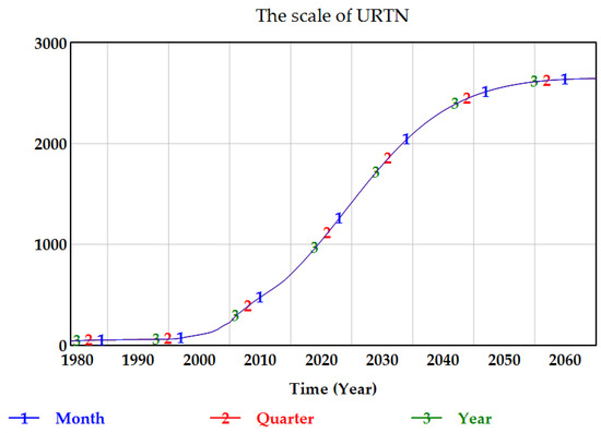 First, the different simulation time steps are set to observe the outputs. For example, the simulation results for the URTN scale are presented in Figure 5. Curves 1, 2, and 3 represent different simulation results when the time step was set to year, quarter, and month, respectively. The results indicate that the system’s behavior is stable, and the SD-LV model is robust.