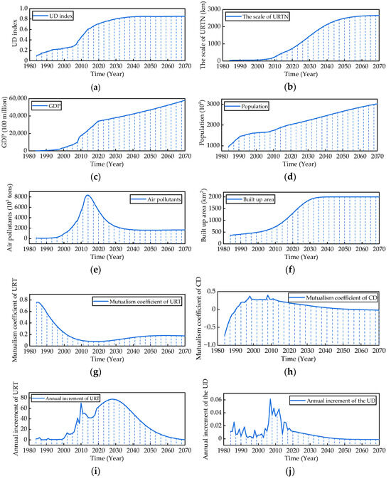 where represents the initial value of the network length; represents the initial value of the UD index; is the UD index in year t; is the GDP in year t; is the population size in year t; is the built-up area in year t; represents air pollutants in year t; is the sharing ratio of URT; 0.5 is the weighting factor; is the annual increment of the UD index; is the annual increment of GDP; in annual increment of air pollutants in year t; is the migration population increment in year t; is the annual increment of the built-up area; represent the weight value for different factors; is the growth rate of the UD index; is the maximum scale of URTN; is the maximum scale of UD index; is the cost of URT; is road traffic congestion in year t; is the mutualism coefficient of UD on the URT; is the mutualism coefficient of the URT on UD.