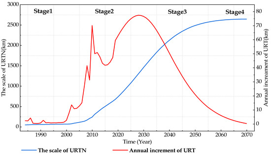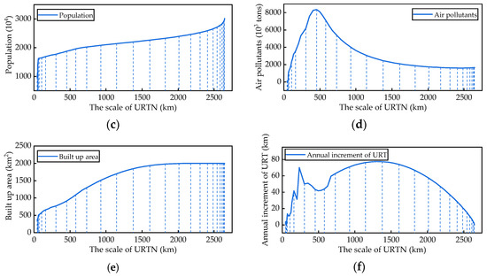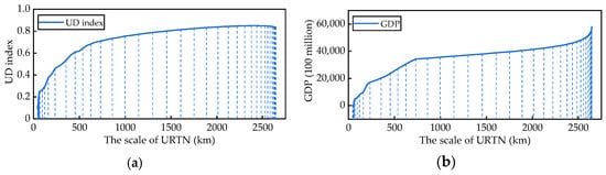 With urban development (UD), the urban rail transit (URT) has played a crucial role in promoting urban growth. A reasonable scale of the URT network (URTN) can enhance travel efficiency, increase economic activities, and promote UD. In turn, more resources are provided in the city for URT construction [1,2,3,4]. However, some problems arise during the URT construction process. Certain cities have grappled with financial crises stemming from excessive construction, while other cities have struggled to meet transportation demand due to inadequate scale, which has resulted in inhibitory effects on UD. Therefore, it is essential for UD to investigate the reasonable URTN scale.