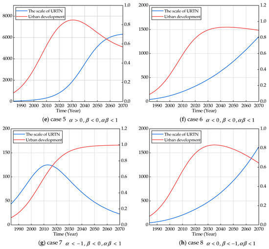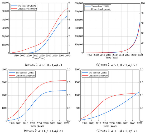 where and represent the URTN scale and the scale of the UD index; represent their growth rates, respectively; and denote their maximum growth scales, respectively; denotes the effect of UD on the URTN scale. means that the city is no longer willing to provide resources for URT construction. indicates that UD has a promoting effect on the URT. denotes the effect of the URT on UD. indicates that URT has not played a role in promoting UD, whereas means that URT has a promoting effect on UD.