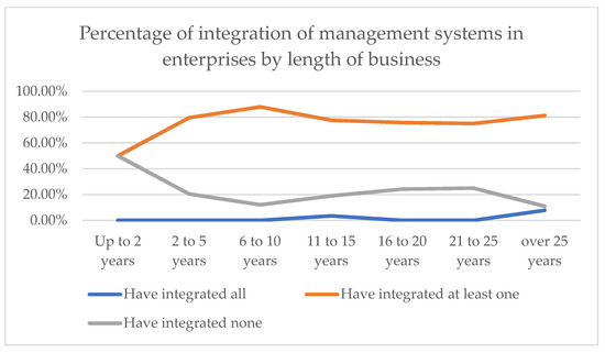 Another aspect that could significantly influence the level of integration of the observed management systems in SMEs is the business sector in which they operate. During the research and subsequent data processing, Table 7 and Figure 1 were produced to show the degree of integration of CM, RM and BCM systems in SMEs in different industries. The research surveyed SMEs in each sector to determine whether they had all three of the observed management systems, at least one of the observed management systems, or none of the observed management systems in their internal environment.