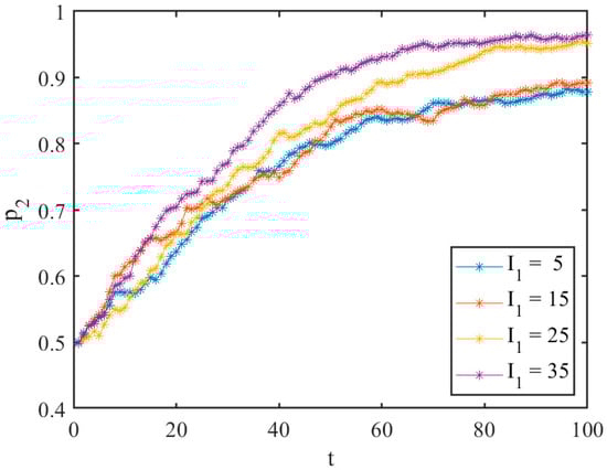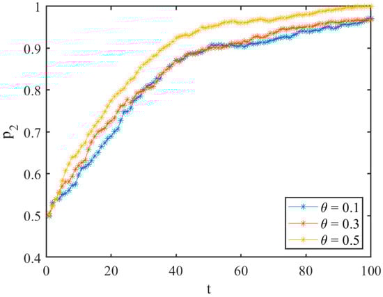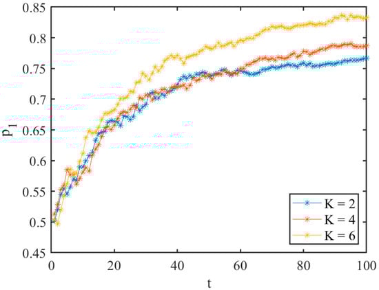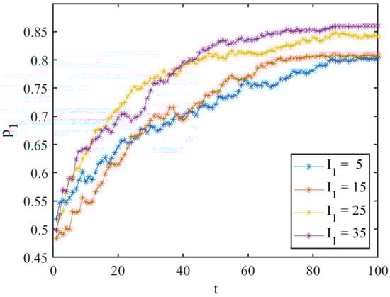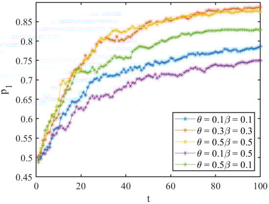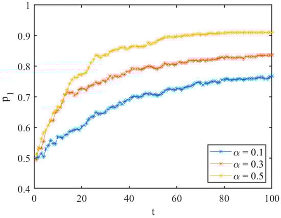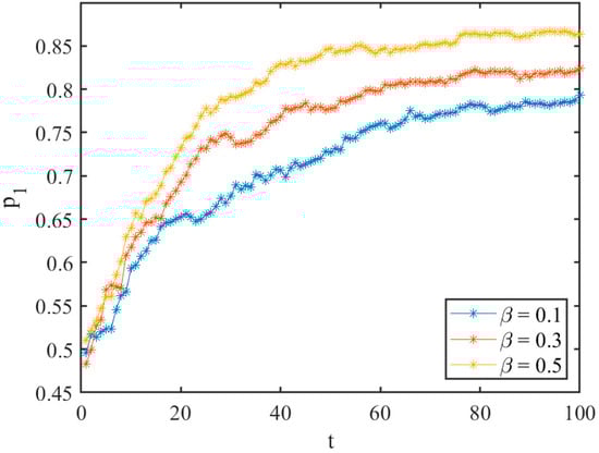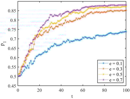 The simulation results show that the evolution results under each parameter value basically reach a stable state when 100 cycles have evolved, so the evolution duration , i.e., the number of simulation iterations, is set to 100.