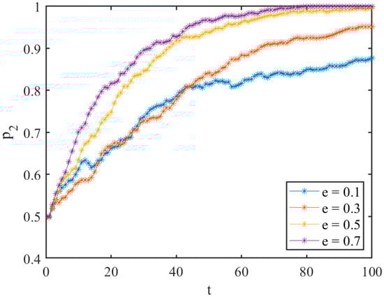 The proportion of AI technology products in the mainstream market can reflect the degree of AI technology’s intrusion into the mainstream market from the non-mainstream market, which is one of the technical characteristics and is determined by the combination of the probability of invasion and the erosion ability of AI technology, and a higher value of indicates that the degree of subversion of the mainstream market is greater, i.e., the more extensive the scope is of the replacement of conventional technology. As can be seen from Figure 3 and Figure 4, with the same value of , the diffusion proportion of AI technology in non-core enterprises is higher than that of its diffusion proportion in core enterprises, and with the increase in the value of , the diffusion of AI technology becomes more and more extensive. The results show that since the correlation between non-core enterprises and the original enterprise network is not as strong as that of core enterprises, in the face of the invasion of the mainstream market by the emerging technology of AI technology, non-core enterprises are more motivated than core enterprises to try out the new technology without the constraints imposed by the original technological system and so on.
