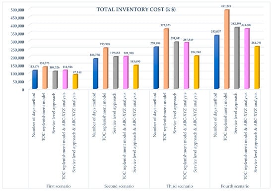 - The TOC replenishment model and its combination with the ABC–XYZ analysis approach consistently resulted in the highest total inventory costs across all scenarios. The number-of-days method ranked third in terms of the total inventory costs. The service level approach showed a noticeable reduction in total inventory costs compared to these three methods. The second proposed hybrid methodology demonstrated the lowest total inventory costs among all methodologies and scenarios.
