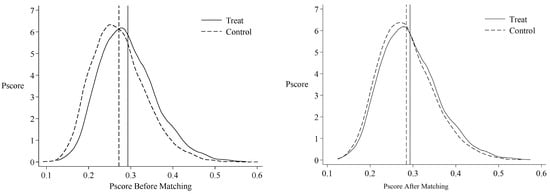 Meanwhile, Figure 1 shows the kernel density plots of the two sets of propensity score values before and after matching. Before matching, the curves are more deviated, and after matching, the two curves are closer, and the distance between the two sets of mean values is reduced.