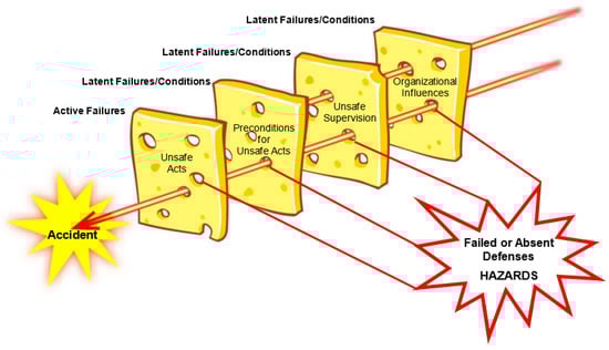 - Wiegmann, D.A.; Wood, L.J.; Cohen, T.N.; Shappell, S.A. Understanding the “Swiss cheese model” and its application to patient safety. J. Patient Saf. 2022, 18, 119–123. [Google Scholar] [CrossRef]