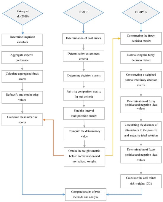 Furthermore, upon examination of the literature, it is evident that various studies were conducted on the risk management process, utilizing comparable MCDM techniques in other sectors. Chen and Wu [] proposed a revised failure mode and effect analysis approach to selecting new suppliers. They applied the fuzzy AHP method to prioritize and evaluate supplier selection criteria and sub-criteria. Gul and Ak [] proposed a comparative methodology for quantifying risk ratings in OHS risk assessment. Researchers used linguistic terms and Pythagorean fuzzy sets, which provide greater independence in their evaluations. The fuzzy AHP-fuzzy VIKOR-integrated method in quantifying risk ratings is also provided. Bakıoglu and Atahan [] prioritized risks in self-driving vehicles by using AHP-integrated TOPSIS and VIKOR methods with Pythagorean fuzzy sets. Çolak and Kaya [] suggested a MCDM methodology based on these methods to evaluate renewable energy alternatives for Turkey. The interval type-2 fuzzy AHP method is applied to determine the weights of decision criteria, and the hesitant fuzzy TOPSIS method is applied to prioritize renewable energy alternatives. Norouzi Masir et al. [] aim to assess the risk of flyrock in opencast mines in order to calculate the risk score and minimize the risk of flyrock. They combined the decision-making trial and evaluation laboratory (DEMATEL) method and the fuzzy analytic network process (FANP) technique. Maksimović et al. [] described an attempt to select the most suitable transport system at the open pit mines from the safety and quality point of view. For that purpose, the Evaluation Based on Distance from Average Solution (EDAS) method was used. Wang and Zhang [] present a comprehensive quantitative approach for managing safety in coal mines by using fuzzy AHP. A multi-criteria decision-making model for managing safety in coal mines based on fuzzy set is constructed, which includes 17 factors and was an assessment. Wang et al. [] estimate and rank all of these factors to develop a management model and guide the safety managers in the mining process by using the fuzzy AHP. Li et al. [] conducted a gas explosion risk assessment in Babao coal mine in China. They proposed evaluating the risk of gas explosion in underground coal mines using the Bayesian network and fuzzy AHP.