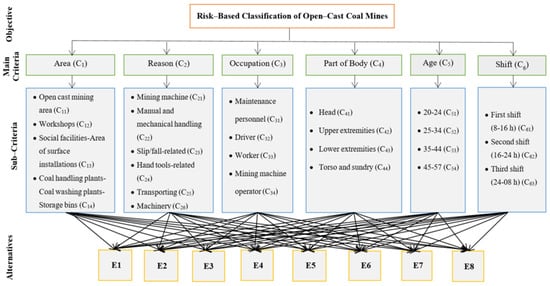 According to these records, TCE’s enterprises (alternatives) are coded as E1, E2, E3, E4, E5, E6, E7, and E8 in the hierarchy (Figure 4). These enterprises are spread over the Aegean Regions, Marmara Regions, and Middle Anatolia in Türkiye. Coal is extracted by the open-cast mining method in E1, E2, E4, E6, E7, and E8, whereas it is extracted both by the open-cast mining method and underground mining method at E3 and E5 enterprises. From these enterprises, E7 was transferred to the private sector in 2012; E4 and E8 were transferred to the private sector in 2013 under the privatization policies of TCE’s top management. As shown in Figure 5, the non-fatal occupational accident records were categorized under 6 main criteria under 25 sub-criteria. The accident location (area) main criterion was categorized into four sub-criteria: open-cast mining area (C11), workshops (C12), social facilities area of surface installations (C13), and coal handling plants–coal washing plants–storage bins (C14). The open-cast mining area is defined as the area that extracted the coal using heavy-duty mining equipment (heavy-duty mining trucks, hydraulic mining shovels, draglines, excavators, large wheel loaders, large dozers, rotary drill rigs, rock drills, and motor graders). Maintenance of the mining equipment is conducted in workshops. They show similarities to many other service workshops, except that the powered mobile plant is increasingly larger. The area of surface installations is the facility areas except for the coal handling plants, workshop, and open-cast mining area. A facility that washes coal to remove waste material from coal is defined as a coal handling plant []. The accident type criterion (reason) was categorized into six sub-criteria as mining machine (C21), manual and mechanical handling (C22), slip/fall (C23), hand tools-related (C24), transporting (C25), and machinery (C26). The occupation main criterion has four sub-criteria: maintenance personnel (C31), driver (C32), worker (C33), and mining machine operator (C34). The part of the body main criterion has four sub-criteria: head (C41), upper extremities (C42), lower extremities (C43), as well as torso and sundry (C44). The age main criterion was categorized according to the ESAW criteria as 20–24 (C51), 25–34 (C52), 35–44 (C53), and 45–57 (C54) []. The last main criterion of the hierarchy is the shift criterion, which was categorized as first shift (8–16 h) (C61), second shift (16–24 h) (C62), and third shift (24–08 h) (C63).