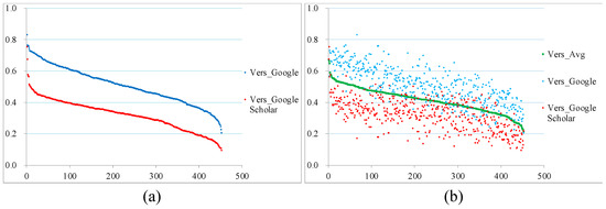Values of the versatility index of the 452 selected intelligent robotic technologies: (a) the Vers_Google and Vers_GoogleScholar values are calculated and plotted in descending order; (b) the Vers_Avg values are calculated and plotted in descending order, along with the corresponding Vers_Google and Vers_GoogleScholar values.