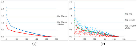 Values of the significance indicator of the 452 selected intelligent robotic technologies: (a) the Sig_Google and Sig_GoogleScholar values are plotted in descending orders; (b) the Sig_Avg values are plotted in descending order, and the corresponding Sig_Google and Sig_GoogleScholar values are also presented in the figure.