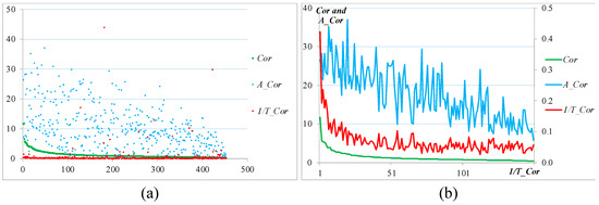Figure 6a shows the commerciality values of all the 452 technologies in descending order, as well as the corresponding values of the upper ( denoted as A_Comk) and lower , denoted as I/T_Comk) parts. Only two technologies have exceptionally high commerciality values over 11, 55 technologies with commerciality values of 2 to 6, while the others’ correlation values are below 2.
